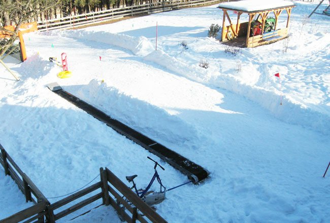 Theoretisch könnte der neue "Pedalo Zauberteppich Skilift" 24 Stunden lang in Betrieb sein. Voraussgesetzt Papi & Mami haben Lust und Laune und sind vor allem auch im Winter "ein bisschen" begeisterte Radfahrer. Den leichtes Treten am Ski-Pedalo ist notwendig und schon können vier Kinder gleichzeitig bequem bergauf transportiert werden.