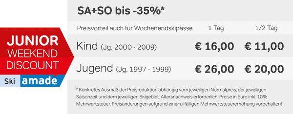 Ski Amadé Junior Weekend Discount: Jeden Samstag und Sonntag bis Saisonende fahren Kinder und Jugendliche zum ermäßigten Preis. Mehr Infos gibt es hier!