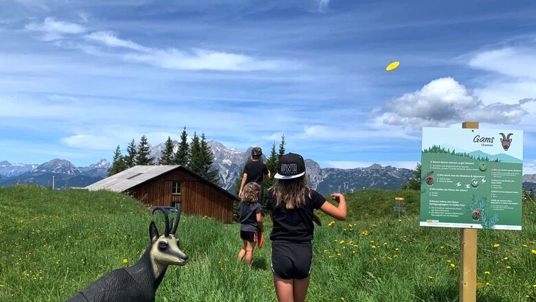 Unser tierischer Disc Golf Parcours ist perfekt für Familien und Freunde und alle, die mehr über die heimische Tierwelt erfahren möchten. Unser Tipp: Legt an unserem Ennslingalm-Speicherteich eine Pause ein! Die Aussicht ist sensationell schön dort.