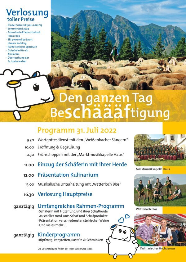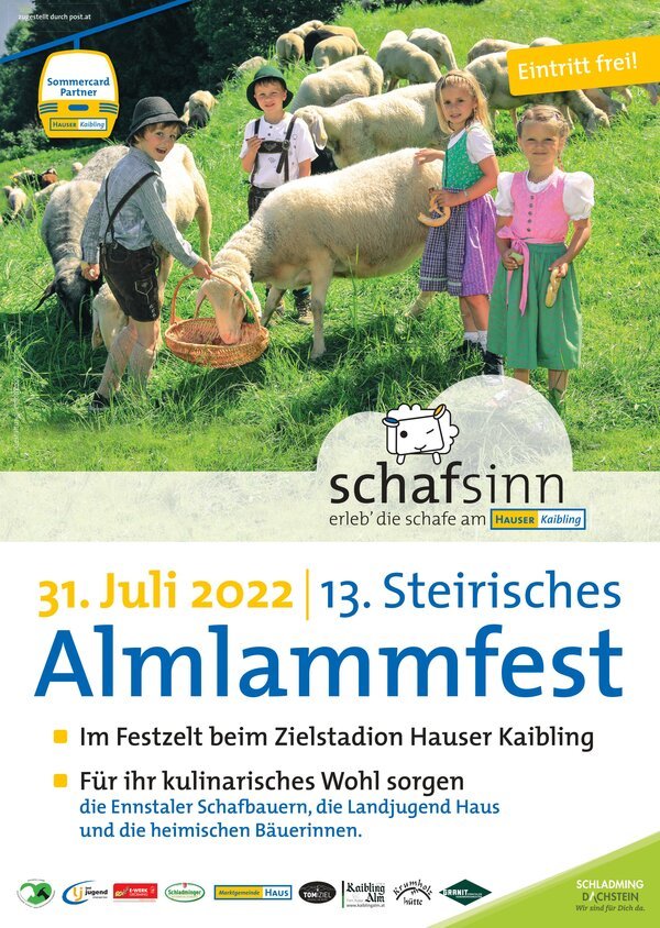 Einer der Höhepunkte des Sommerbetriebes am Hauser Kaibling bildet das Steirische Almlammfest, das am 31. Juli bereits zum 13. Mal stattfindet. Der Einzug der Schäferin mit Hütehund und Schafherde, Live-Musik, kulinarische Köstlichkeiten „rund ums Schaf“, heimische Aussteller mit ihren Schaf-Produkten, ein tolles Kinderprogramm uvm. machen diesen Tag zum Erlebnis für die ganze Familie. EINTRITT FREI! Alle Informationen zum Almlamm-Projekt findest Du HIER!