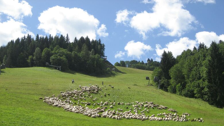 Die "Stars des Tages" waren zweifellos die über 700 Schafe von Ennstaler Schafbauern, die im Sommer rund um den Hauser Kaibling weideten. Sie pflegten in der warmen Jahreszeit Pisten- und Almflächen. Damit dies reibungslos und effektiv funktionierte, wurden sie von Schäfer Simon Winterling und seinem Hütehund geleitet und sicher ins Tal geführt.