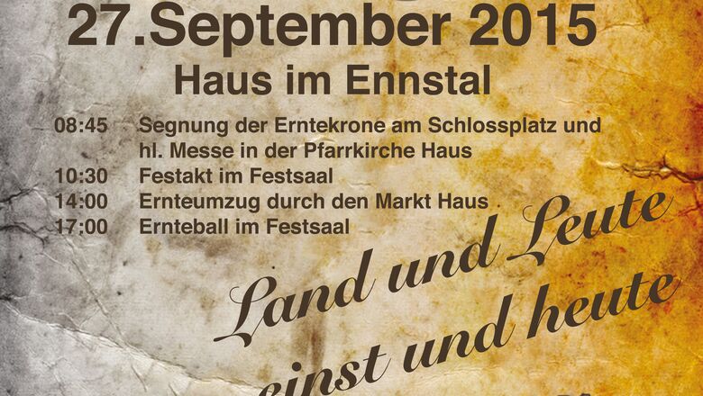 Bereits um 08:45 Uhr startete das Fest mit der Segnung der Erntekrone am Schlossplatz und der heiligen Messe in der Pfarrkirche Haus. Danach fand der feierliche Festakt im Festsaal statt und um 14:00 Uhr zog der Ernteumzug durch den Markt Haus. Ab 17:00 Uhr wurde zum Ernteball im Festsaal geladen.