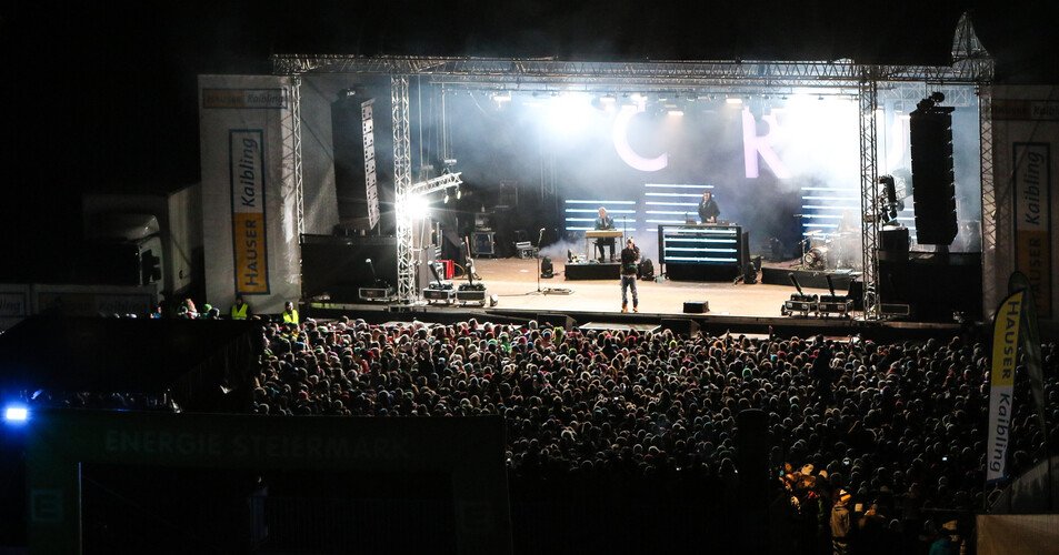 An die zehntausend Skigäste tummelten sich am Valentinstag, mit dem die Semesterferien in der Steiermark und in Oberösterreich eingeläutet wurden, am Hauser Kaibling, genossen das herrliche Wetter und die perfekt präparierten Pisten. Unter ihnen befand sich mit Carlo Waibel auch jener 25-jährige Stuttgarter, der unter seinem Künstlernamen CRO seit zwei Jahren zu den angesagtesten Künstlern im deutschsprachigen Europa zählt. Dem unbeschwerten Skitag folgte am Nachmittag ein lockerer Termin bei der Hauser Kaibling-Talstation mit Presse und Fans. Während der Rapper mit seiner Gang noch einmal mit der Gondel auf den Berg fuhr, strömten bereits hunderte Besucher aufs Eventgelände. Dirty Impact eröffnete mit heißen Rhythmen den Abend, anschließend stimmte MC Yankoo die mittlerweile Tausenden Besucher auf den Höhepunkt des Abends – das Live-Konzert von CRO ein. Und der Rapper mit der Panda-Maske hielt, was er zuvor versprochen hatte. Mit allen Hits aus seinen beiden Nr. 1-Alben „Raop“ und „Melodie“ versetzte er seine Fans in eine sensationelle Stimmung, die bis zum Ende des Konzerts auch nicht mehr abriss. Im Gegenteil: Die begeisterten Besucher, die sich auch als enorm textsicher erwiesen, forderten lautstark einige Zugaben – die CRO und seine Band auch erfüllten. Der Rapper mit der Panda-Maske hatte den Hauser Kaibling und die 6.000 Konzert-Besucher fest im Griff.