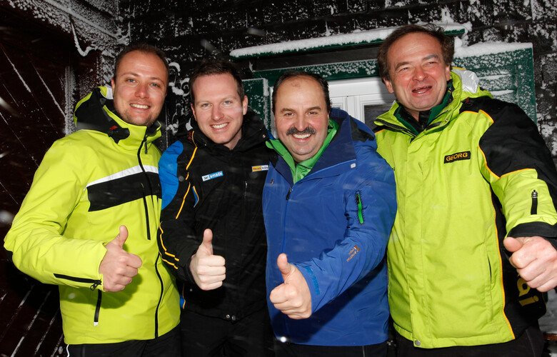 Bildtext 1: Schneegenuss am Hauser Kaibling in der Krummholzhütte v.l.n.r.: Schladming-Dachstein Geschäftsführer Mathias Schattleitner, Hauser Kaibling Geschäftsführer Arthur Moser, Starkoch Johann Lafer und Planai-Hochwurzen Geschäftsführer Georg Bliem!